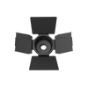 The F10 Barn Doors mount onto the F10 Fresnel lens for light shaping from large sources. The 8-leaf system features large leaves and helper flags for precise shaping. Use the included black reflector dish with drop-in accessory slot to minimize light source size for sharper cuts, and to mount to any Bowens mount fixture. Includes safety cable and mounting point for added security.