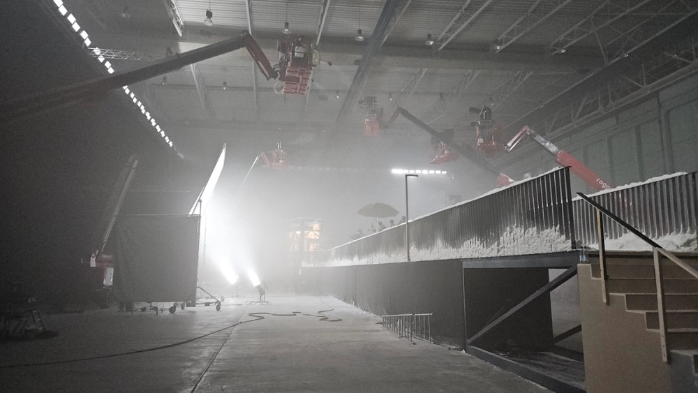 The Electro Storm XT26 became Greiner’s most dynamic tool on set. In studio interiors dressed with Soft Drops, the XT26—placed just behind the printed backdrops—simulated hard alpine sunlight filtering through overcast skies. Its wide Fresnel allowed light to pass cleanly through the material while keeping the fixture itself hidden, producing natural roll-off without clipping or artefacts.